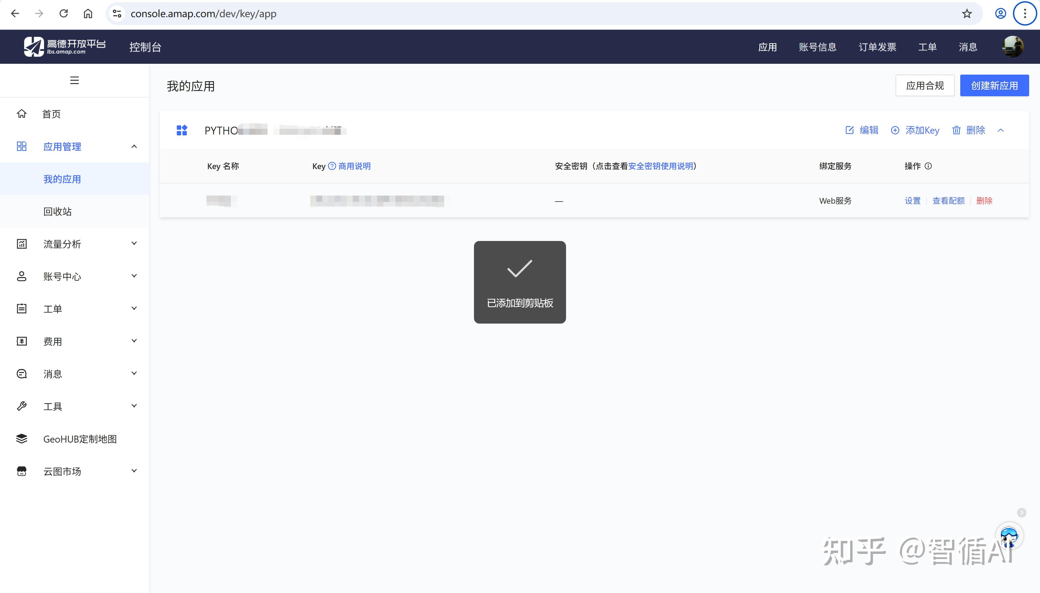 - 在应用下点击“添加Key”,服务平台选择“Web服务”,提交后获取API密钥(Key)