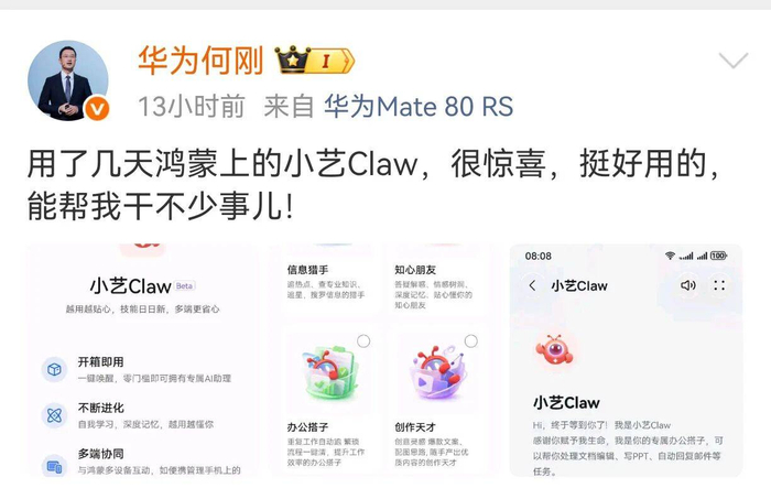 最近一段时间的OpenClaw真的是非常火爆,许多公司和个人爱好者都纷纷开启了“养龙虾”模式,但是对于绝大多数的普通人来说,“养龙虾”的门槛还是有些高的。今日,华为终端BG CEO何刚通过社交平台晒出了一份“小艺Claw”的功能界面截图,正式官宣推出鸿蒙版小艺Claw,这款基于OpenClaw开源框架打造的AI助理,成为鸿蒙生态布局AI智能体的重要里程碑。