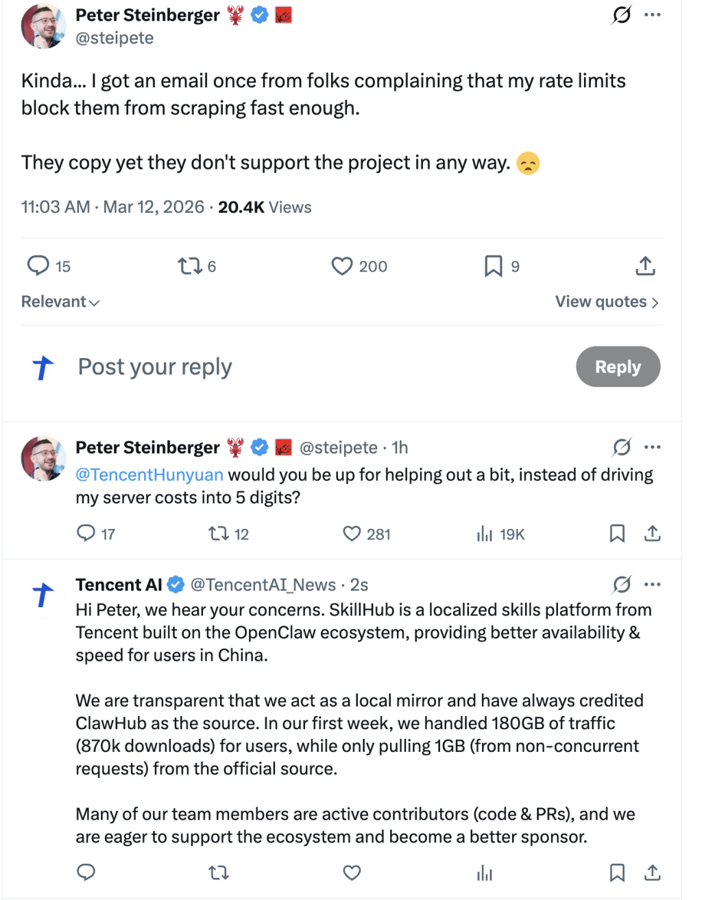3月12日,OpenClaw创始人Peter Steinberger在社交媒体公开发文“抱怨”腾讯:“只会照搬抄袭,却没有以任何形提供过支持。”他还提及腾讯混元团队并喊话:“你们能不能搭把手帮衬一下,而不是把我的服务器成本硬生生推高到五位数?”