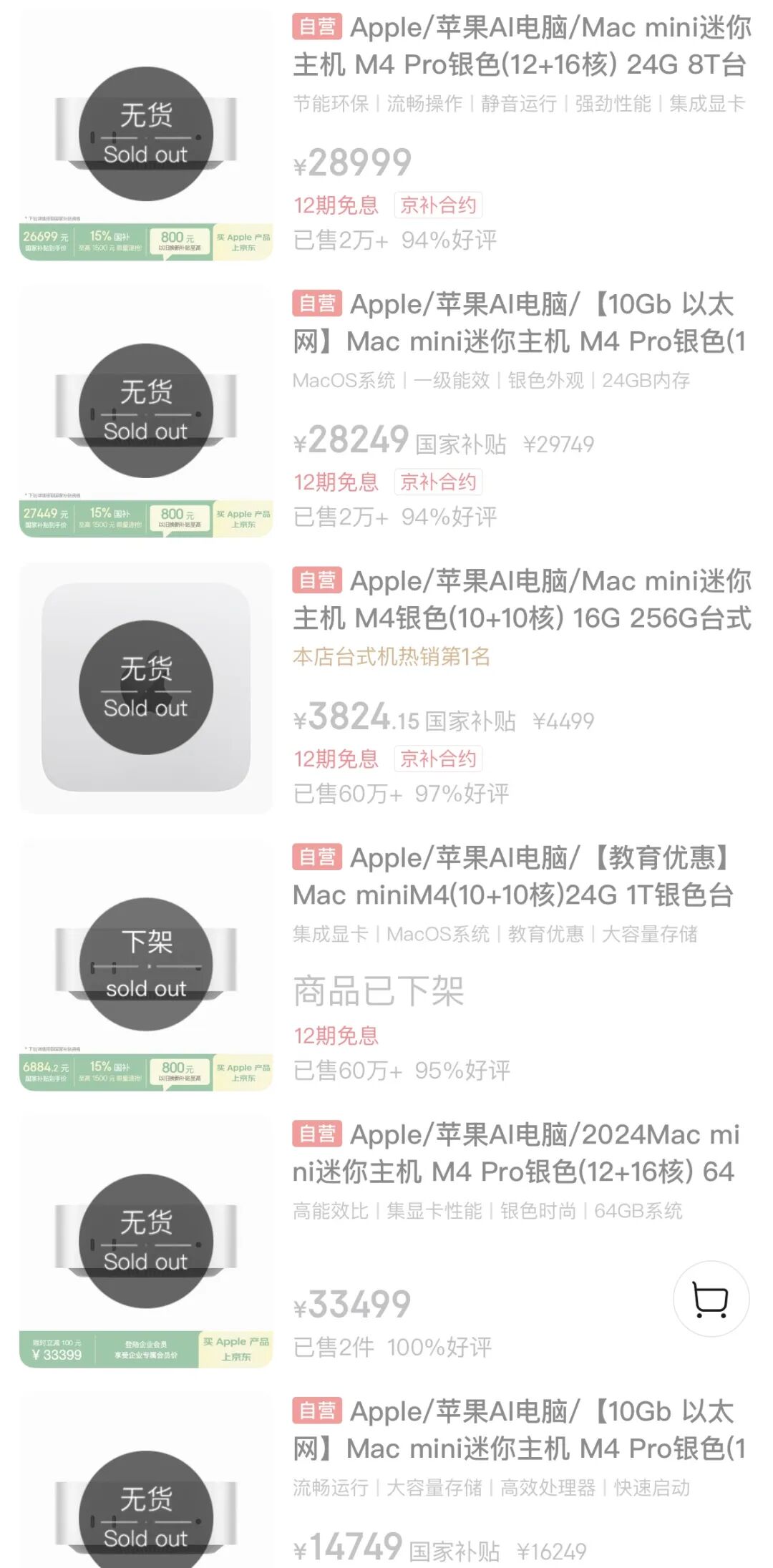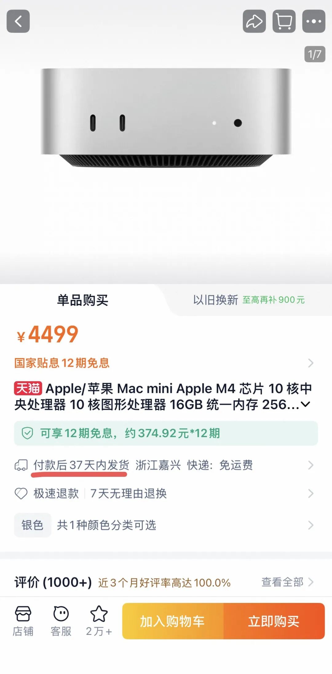 记者同步核实官方渠道,苹果中国官网显示,北京、上海、广州、杭州、武汉等全国多地线下门店目前均无Mac mini现货。不仅如此,在第三方平台京东上的苹果官方旗舰店中,Mac mini M4全系产品皆处于无货或下架状态;淘宝平台虽显示有货,发货等待时间却长达37天。