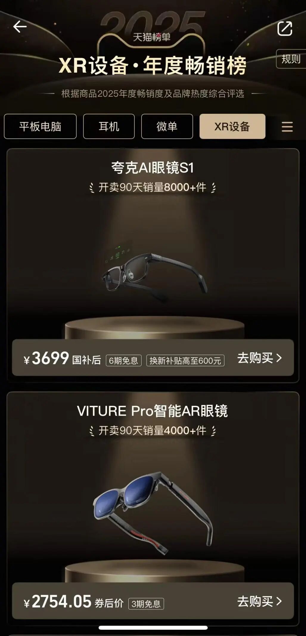 热销并非偶然。早在2025年11月末,阿里就通过夸克AI眼镜完成了一次关键试水。据天猫千问官方旗舰店,截至2026年3月12日二十点三十分,夸克AI眼镜已登顶天猫XR设备2025年度畅销榜,开卖90天销量超8000件。