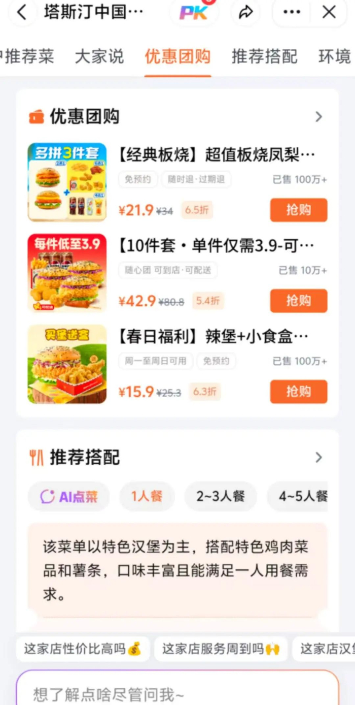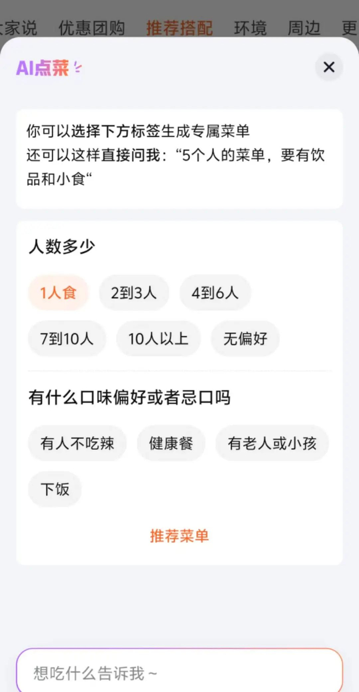 探饭还有AI点菜功能,选择好人数和口味偏好或者忌口,AI就会推荐出合适的团购菜单供用户参考。