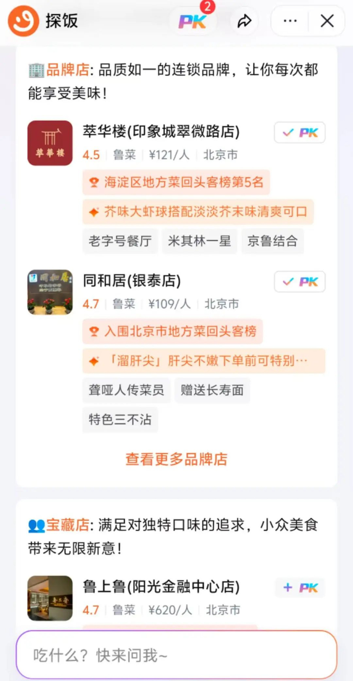 在实际体验中,可以直接问探饭美食问题,比如“北京有什么好吃的鲁菜馆”,随后,探饭便会基于地理位置,且按照连锁品牌和小众美食,划分为品牌店和宝藏店,分别罗列出附近的相关鲁菜餐厅。探饭还会给出具体的推荐理由,比如同和居(银泰店)入围了北京市地方菜回头店,有溜肝尖特色菜,还赠送长寿面等。