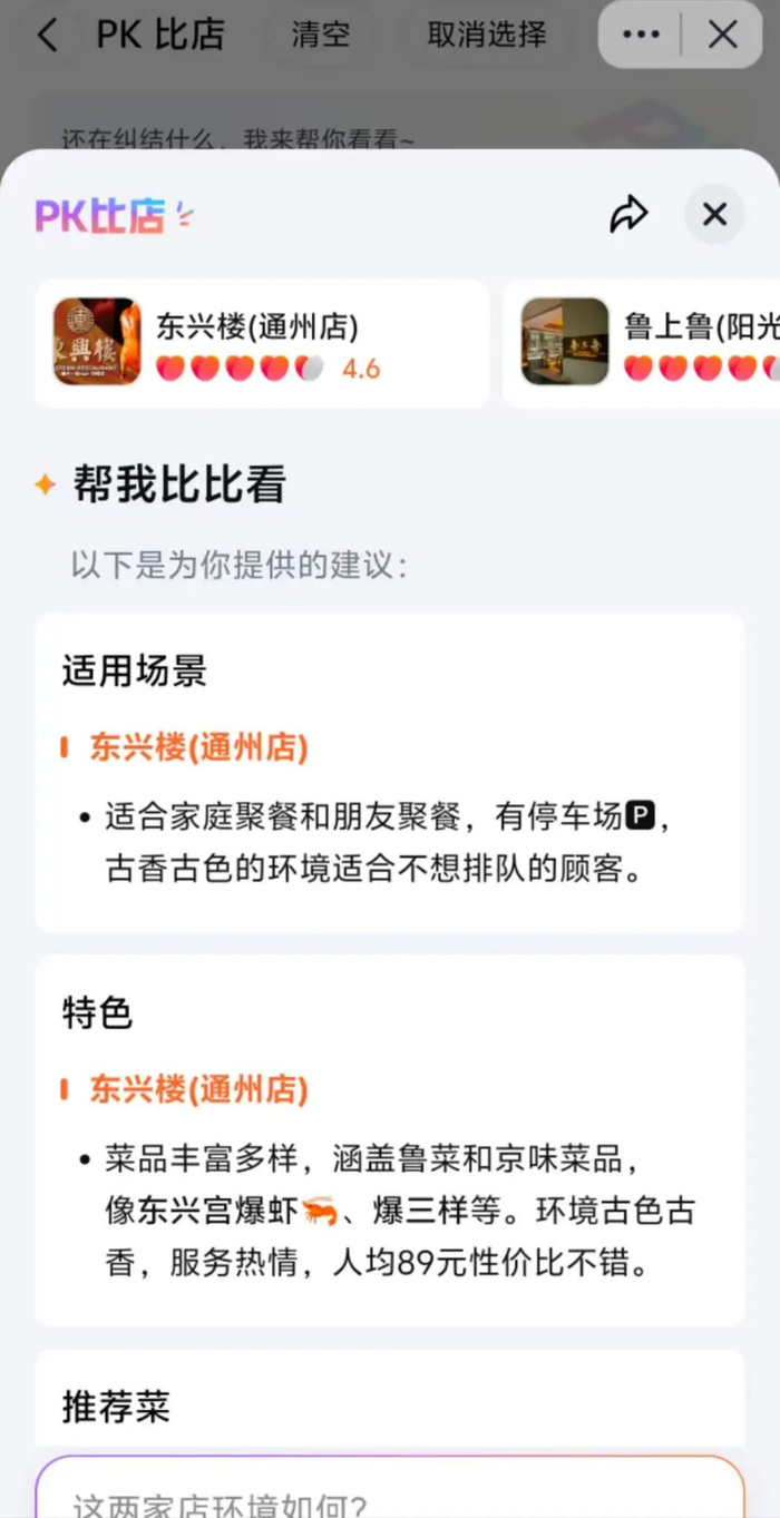 如果用户对于罗列出来的美食店仍然不好做出选择,也可以通过PK比店功能,进一步筛选出合适的美食店。探饭会从适用场景、特色、推荐菜、优劣势等多个维度进行比拼,并进行总结,让用户进行判断。