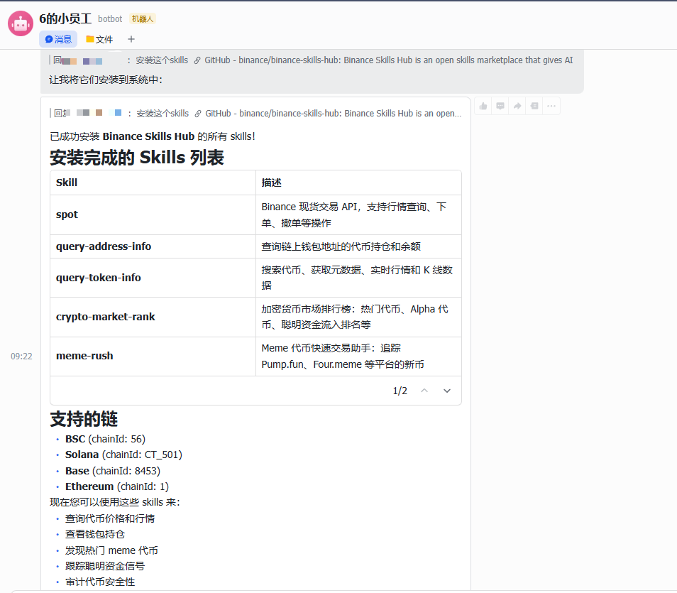 - 现货交易(Binance Spot Skill):支持行情查询、下单/撤单及账户信息管理,兼容主网与测试网。