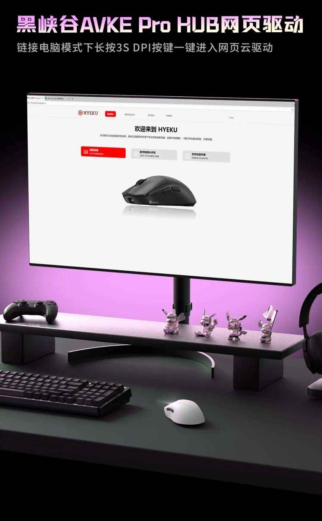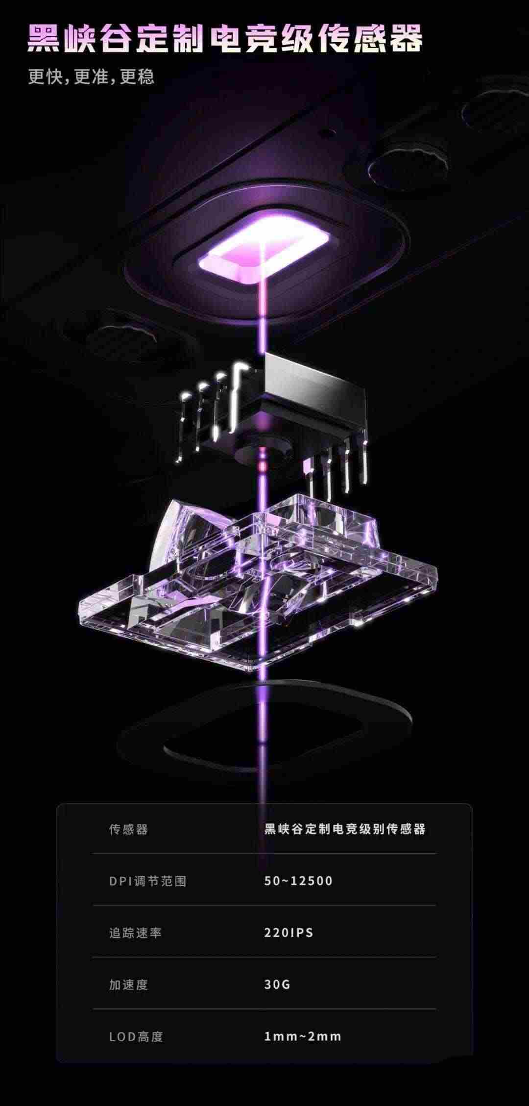 该鼠标搭载黑峡谷定制传感器,支持有线无线 1K 回报率,搭配凯华白刃微动,支持 50~12500 DPI 调节。