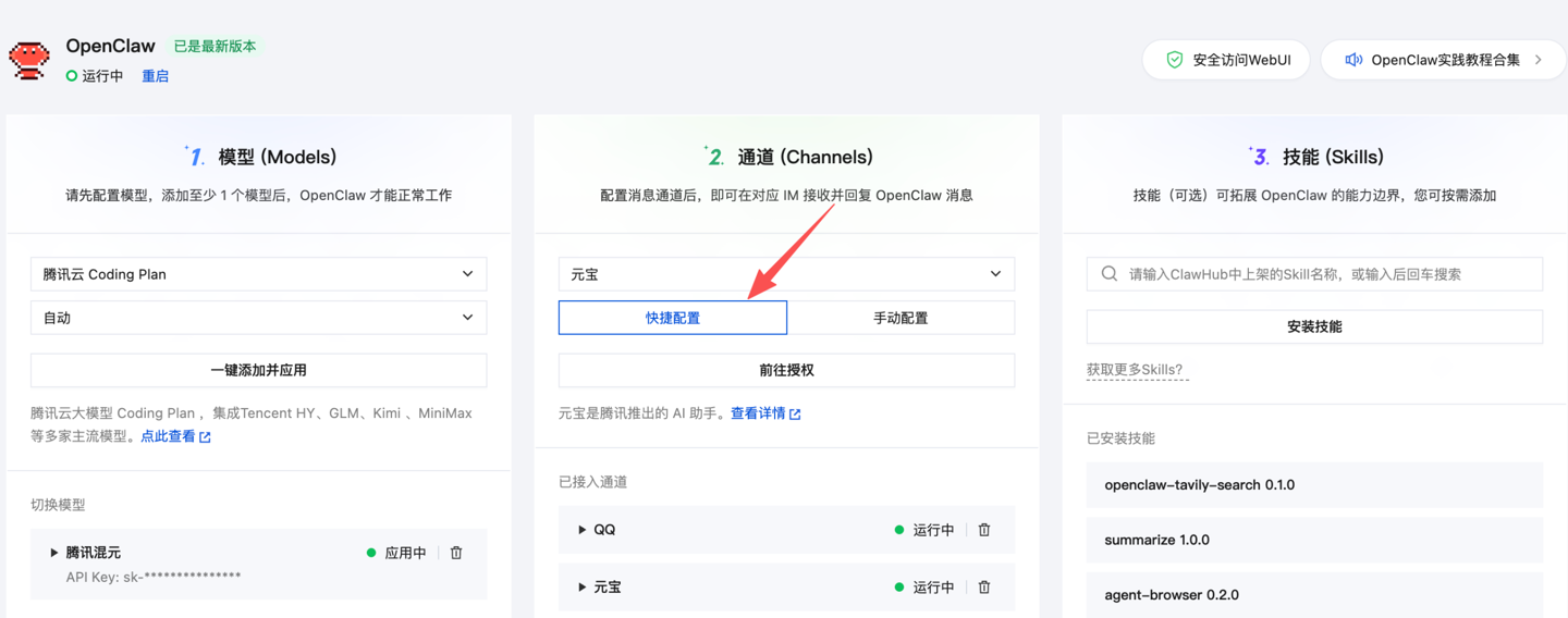 通过腾讯云 Lighthouse 部署 OpenClaw 的用户,还有一种更便捷的方式:在通道配置中选择「快捷配置」,扫码就能完成绑定。