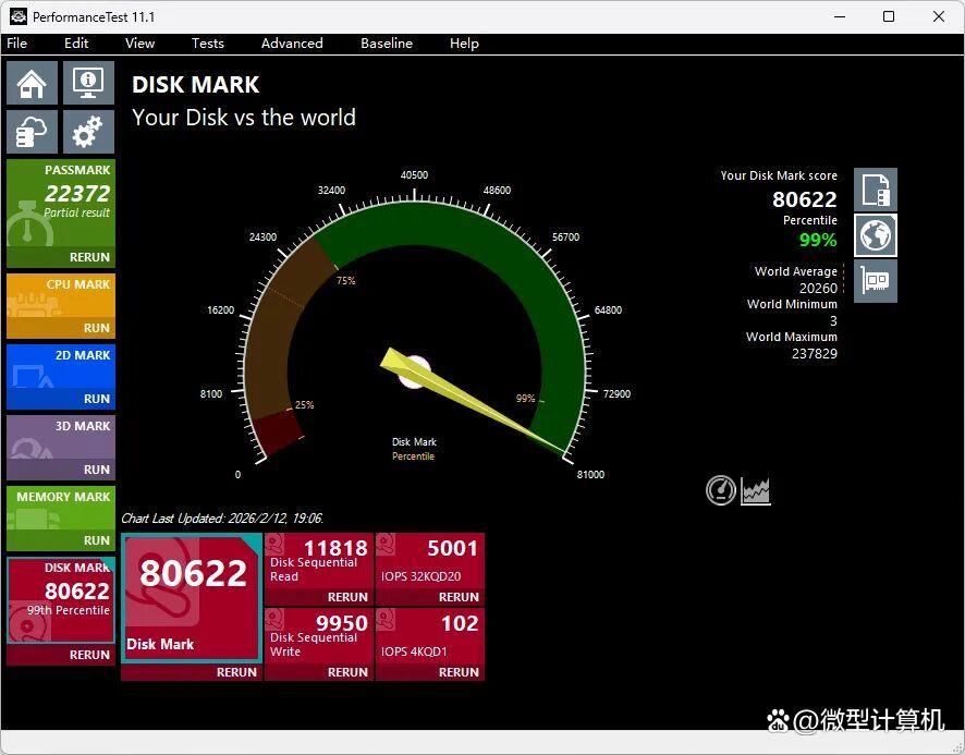同时在AS SSD Benchmark、Anvil‘s Storage Utilities测试中,长江存储PC550商用消费级PCIe 5.0固态硬盘2TB凭借更好的顺序读写与随机读写性能,分别获得了12674分、34886.31分的优秀成绩。高端PCIe 4.0 SSD在AS SSD Benchmark测试中的得分一般不到10000分,在Anvil’s Storage Utilities测试中的得分难以超过30000分。为了让读者更直观地了解长江存储PC550商用消费级PCIe 5.0固态硬盘2TB的性能,我们还使用了可以排名的PerformanceTest 11.1磁盘测试。其得分高达80622,可以击败全球99%的其他存储产品。