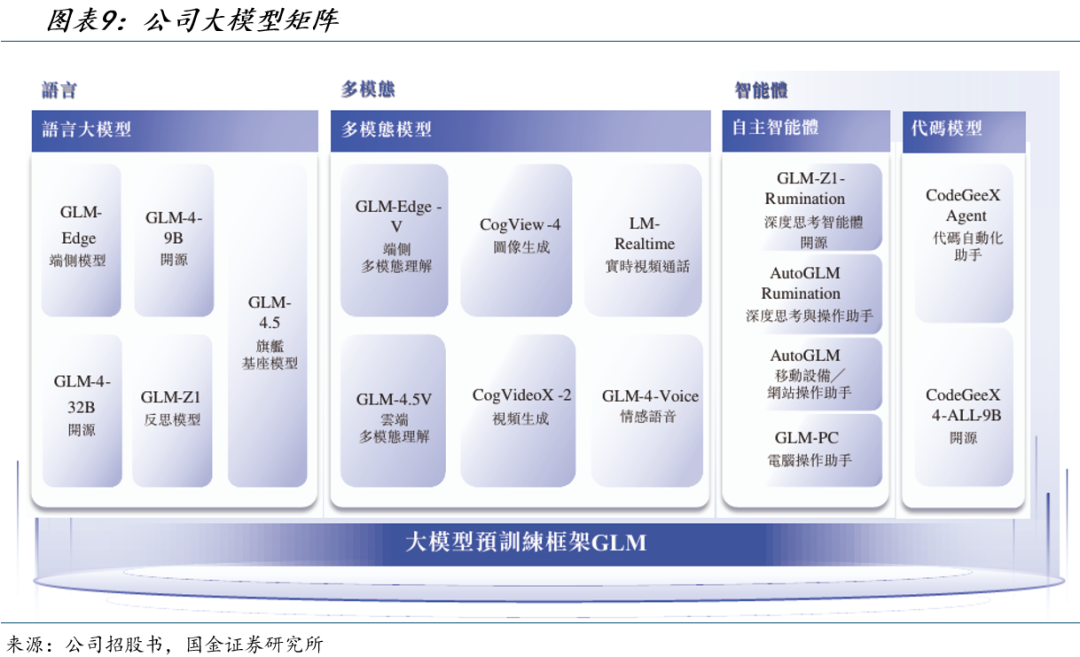 依托自主研发的大模型预训练框架 GLM,公司构建起全面的模型体系,可向客户提供多类型基座模型及快速定制化服务。其模型矩阵覆盖端侧小模型、经济型模型及千亿参数旗舰大模型等不同参数规模,能精准匹配特定客户需求;功能层面则涵盖对话、通用智能体、代码生成、图像理解、文生图/视频、语音交互等多元场景,实现对各类模型应用需求的全面覆盖。