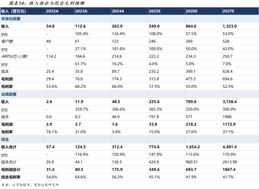 我们预测云端部署收入2025/2026/2027年分别为2.26亿/7.90亿/31.58亿元,对应同比增速+365%/+250%/+300%。增速假设的核心论证如下: