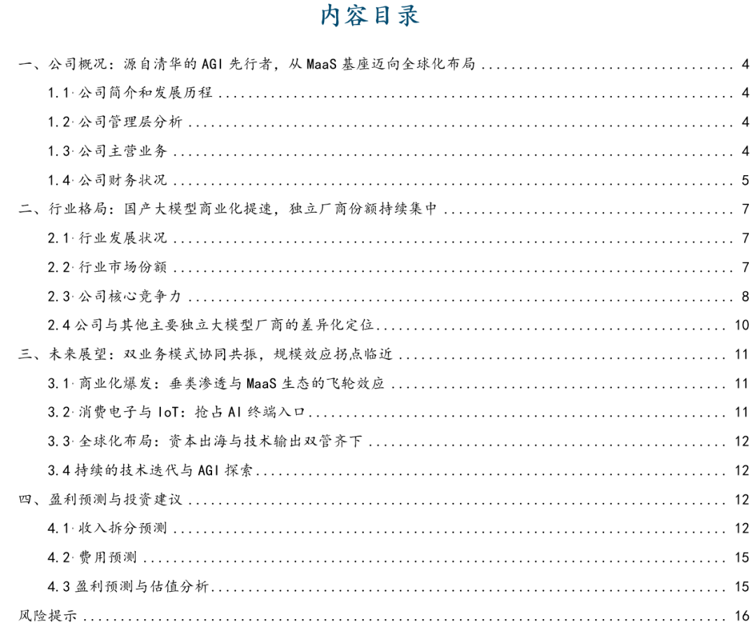 我们认为清华大学背景是公司与国内其他大模型厂商最大的差异化竞争优势,也是我们认为其在基础模型迭代、长期技术壁垒构建与顶尖人才储备上,能持续领跑行业的核心信心所在。