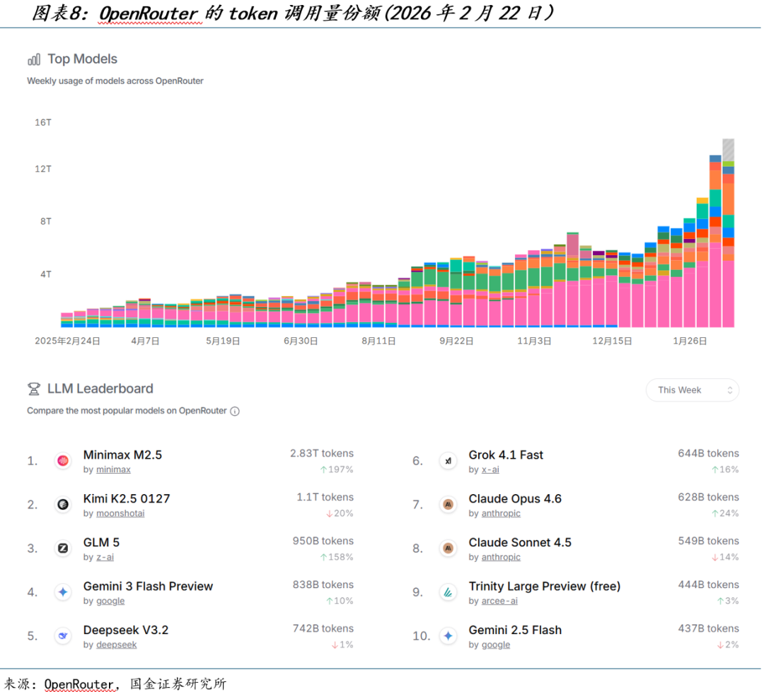 在海外的API聚合平台OpenRouter上,公司的模型也具备极强竞争力,2026年2月22日数据显示公司的GLM 5模型占据OpenRouter的token调用量位居第三名。