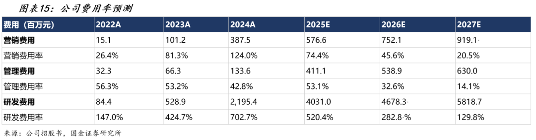 营销费用方面,2022-2024年公司营销费用从1514万元快速攀升至3.87亿元,费用率由26.4%大幅提升至124.0%,反映公司在商业化早期阶段进行了积极的市场拓展与品牌投入。从营销费用结构看,广告及营销开支是最大组成部分(2024年占61.3%),其次为工资成本(占24.2%)。2025H1营销费用208.6百万,其中广告营销支出同比增长18.5%(2025H1收入增长325%,显示获客效率有所提升)。我们预计2025年营销费用为5.77亿元(费用率74.4%),此后随着品牌认知度提升和获客边际成本下降,费用率进一步降至2026年的45.6%和2027年的20.5%。