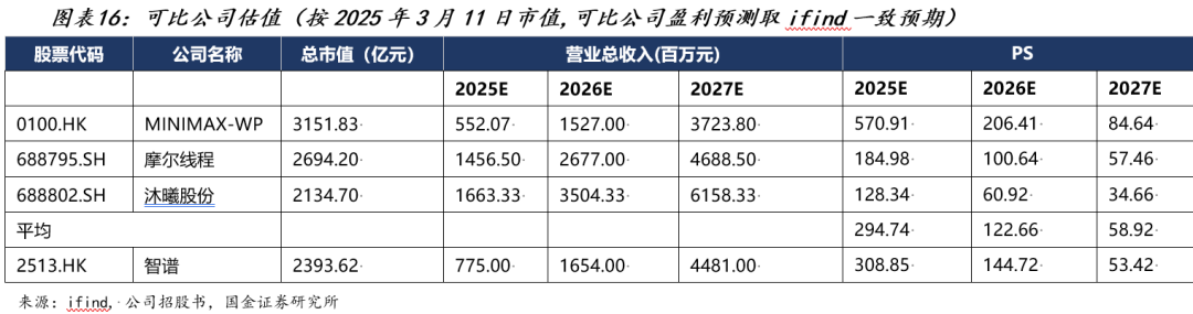 估值与投资建议方面,公司当前仍处于亏损阶段,传统PE估值框架暂不适用,建议以PS估值法为主要参考。我们选取MiniMax(港股大模型直接可比)、摩尔线程和(国产算力,同属国内AI产业新上市公司)作为可比公司。三家公司均处于商业化早期的高研发投入亏损阶段。