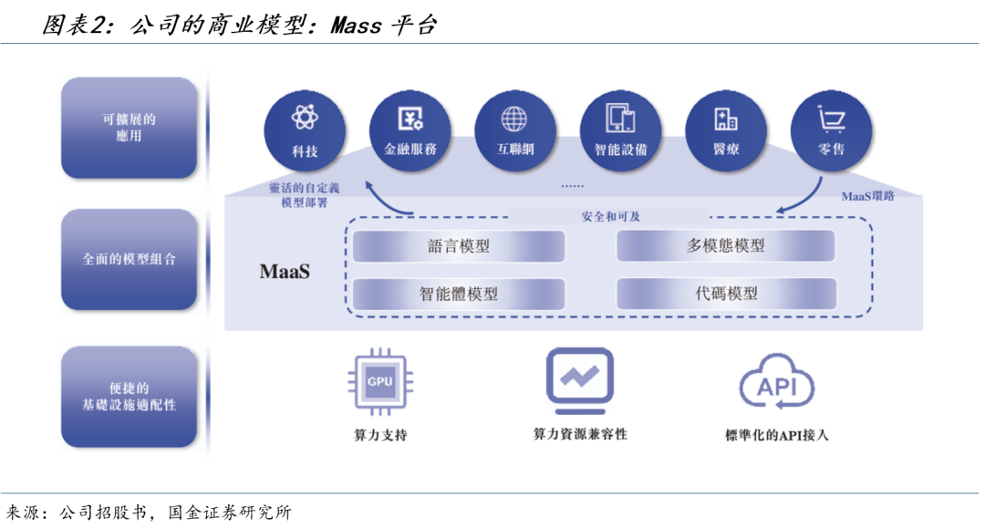 公司围绕一体化MaaS平台组织产品供应,通过云端和本地化两种方式交付智能服务。公司旗下MaaS平台主要提供四类模型:语言模型、多模态模型、智能体模型及代码模型,以及用于模型微调、部署及智能体开发的集成工具。
