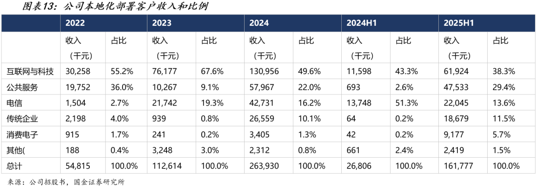 我们认为这种多行业渗透格局对公司的客户黏性具有积极意义,本地化部署客户一旦将大模型深度集成到业务流程中(如金融风控、政务审批、能源调度等),迁移成本极高。同时公司在互联网与科技行业的收入尽管占比下降,但绝对额从2022年的3,026万持续增长到2024年的1.31亿元,说明早期客户并未流失,而是在持续加大投入。这种"老客户不断追加、新行业持续涌入"的增长模式,为本地化部署业务的收入可预见性提供了坚实支撑。客户数方面,公司2022-2024年本地化部署客户数从48家增至123家。2025H1公司已签约95家客户。因此我们预计2025年客户数翻倍至246家(yoy+100%),预计2026年之后随着各行业客户渗透率提升、市场竞争格局趋稳,增速逐步回落,至2026年50%(369家)和2027年43%(528家)。