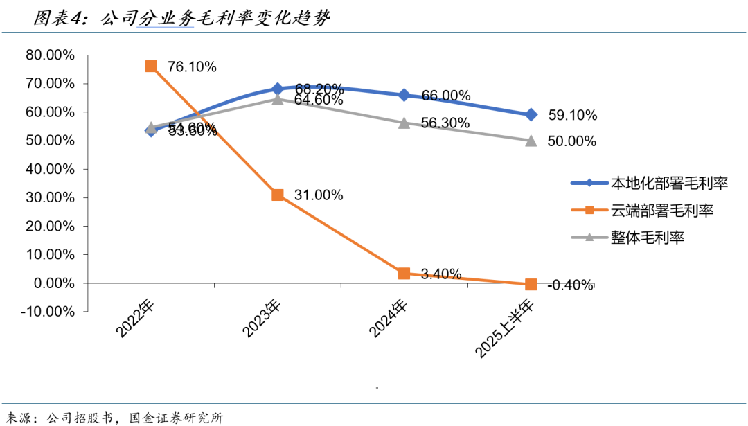 毛利率方面,云端部署毛利率经历了较大波动:2022年为76.1%(基数小参考性有限),2023年降至31.0%,2024年进一步降至仅3.4%。展望未来,我们预计云端毛利率将触底回升,2025/2026/2027年分别为15.0%/27.6%/37.1%。毛利率修复的核心驱动力包括: