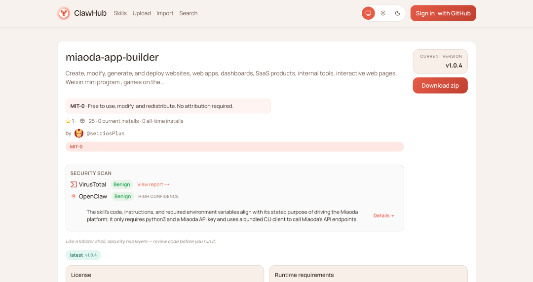 2、前往 ClawHub 搜索「miaoda」,或打开链接:https://clawhub.ai/seiriosPlus/miaoda-app-builder,一键获取秒哒 Skill 压缩包。