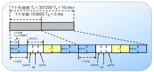 - 每个10ms无线帧包括2个长度为5ms的半帧,每个半帧由4个数据子帧和1个特殊子帧组成。