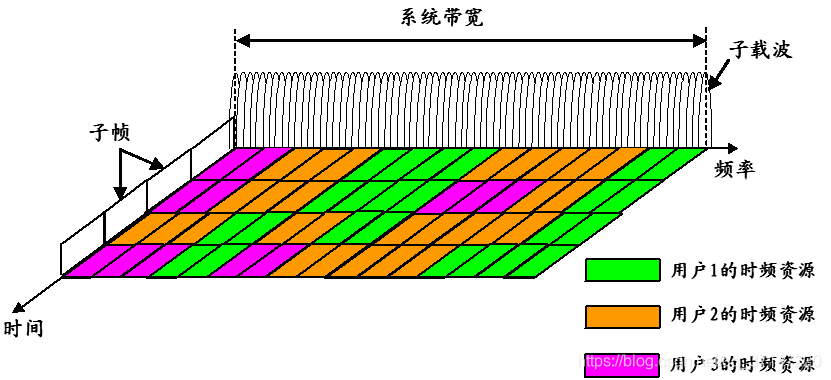 业务信道在不同频段分配给不同的用户。(各用户使用不同的频率)