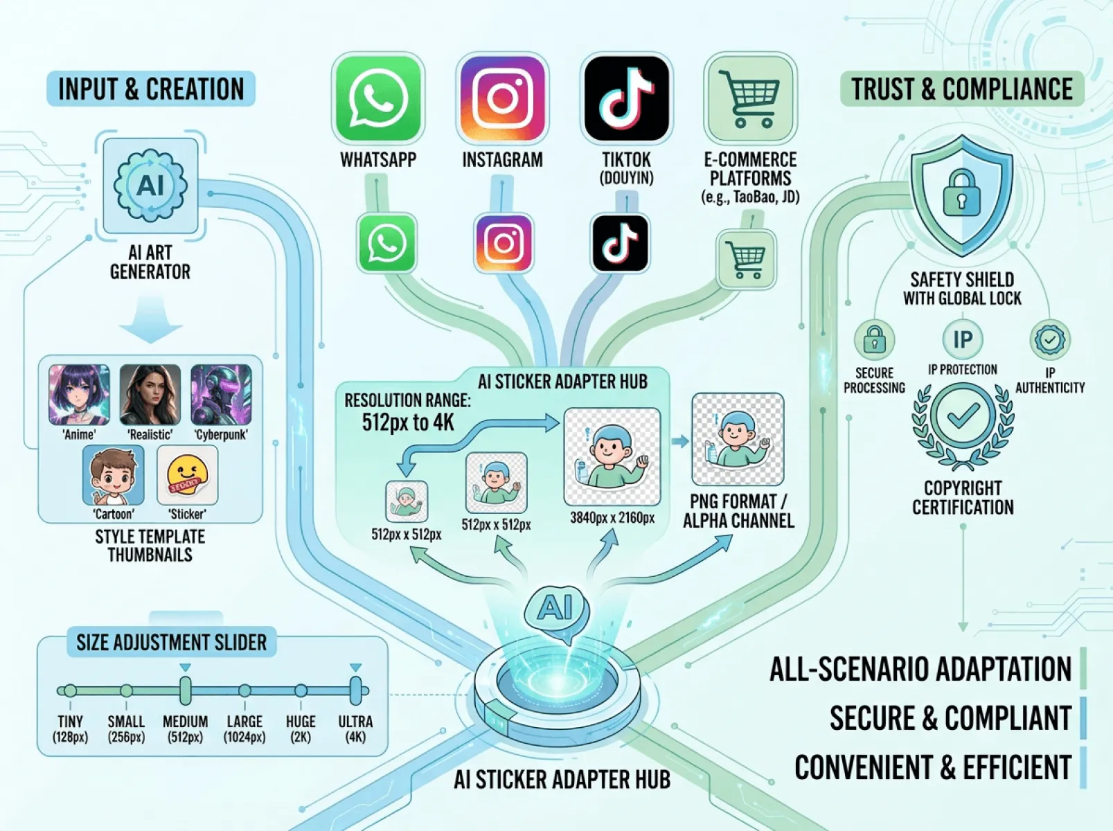 AI贴纸应用场景广泛,个人与企业用户需求不同,各平台对贴纸尺寸、格式要求也有差异。传统工具场景适配性差,需手动调整尺寸格式,增加创作成本。Nano Banana 2的多场景适配能力的为Fast Image AI提供全方位支撑,覆盖全领域需求,同时兼顾安全合规,让创作更省心。