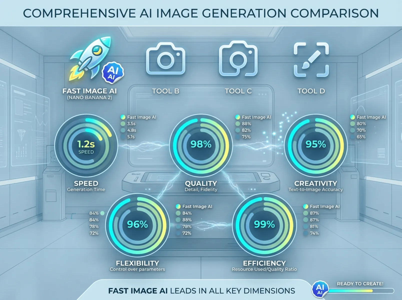 - 指令遵循度:Fast Image AI(搭载Nano Banana 2)92%以上,复杂指令精准落地;主流工具A 60%左右,复杂指令偏差较大;主流工具B 70%左右,部分细节无法呈现;主流工具C 65%左右,易出现理解偏差
