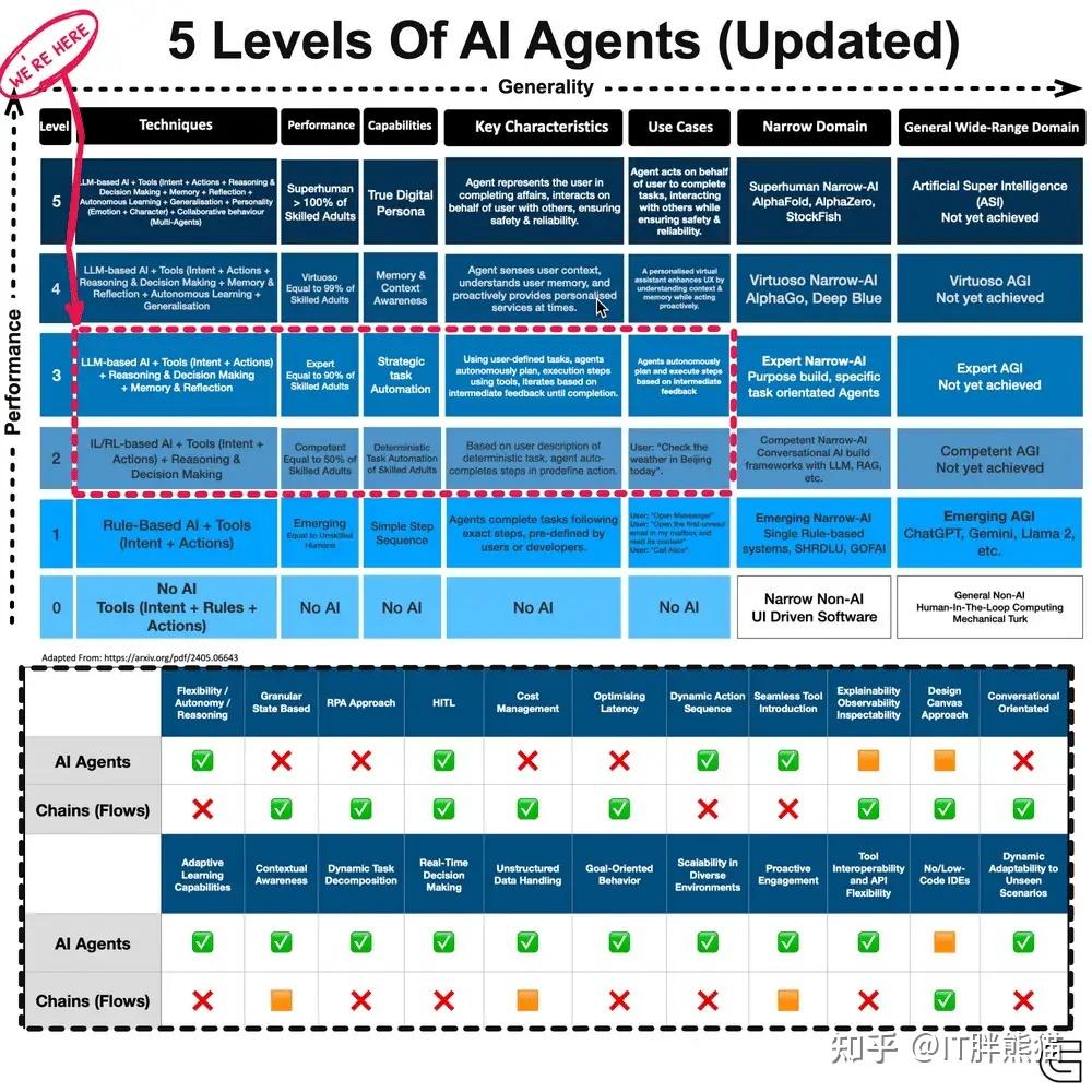 至于说AI中的Agent,一样啦,它也是个Agent,只不过它被AI赋能了,利用AI来做代理的活,它的水平按照能力可以分为五级,其中L4/L5有的时候也会被叫做Agentic AI。
