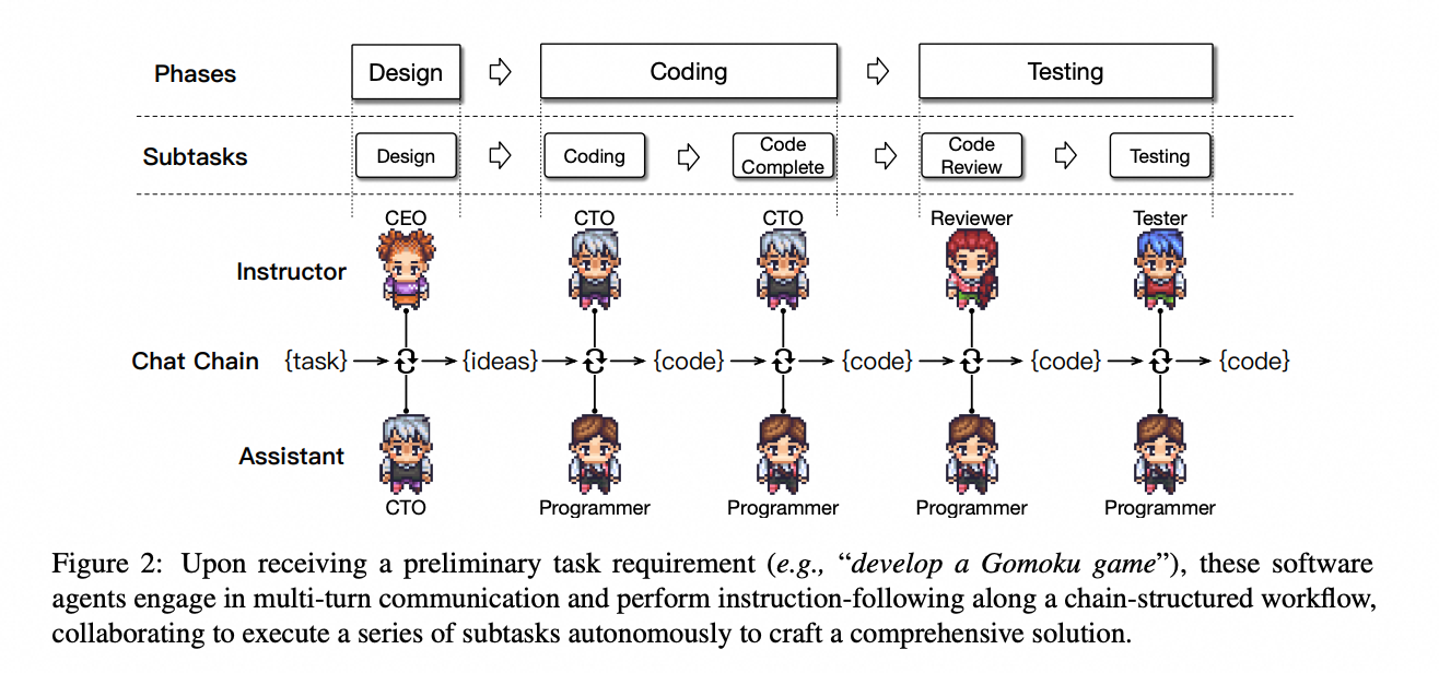 之后,通过对软件开发瀑布模型的进一步分解,形成由原子任务构成的交流链(Chat Chain)。整条链可视为由原子任务组成的 “软件生产线”,链中每个子任务通过专业角色(例如产品设计官、Python 程序员、测试工程师等)的智能体进行对话式信息交互和决策——驱动其进行自动化需求分析、头脑风暴、系统开发、集成测试、GUI 创作、文档编制等全流程软件工程。