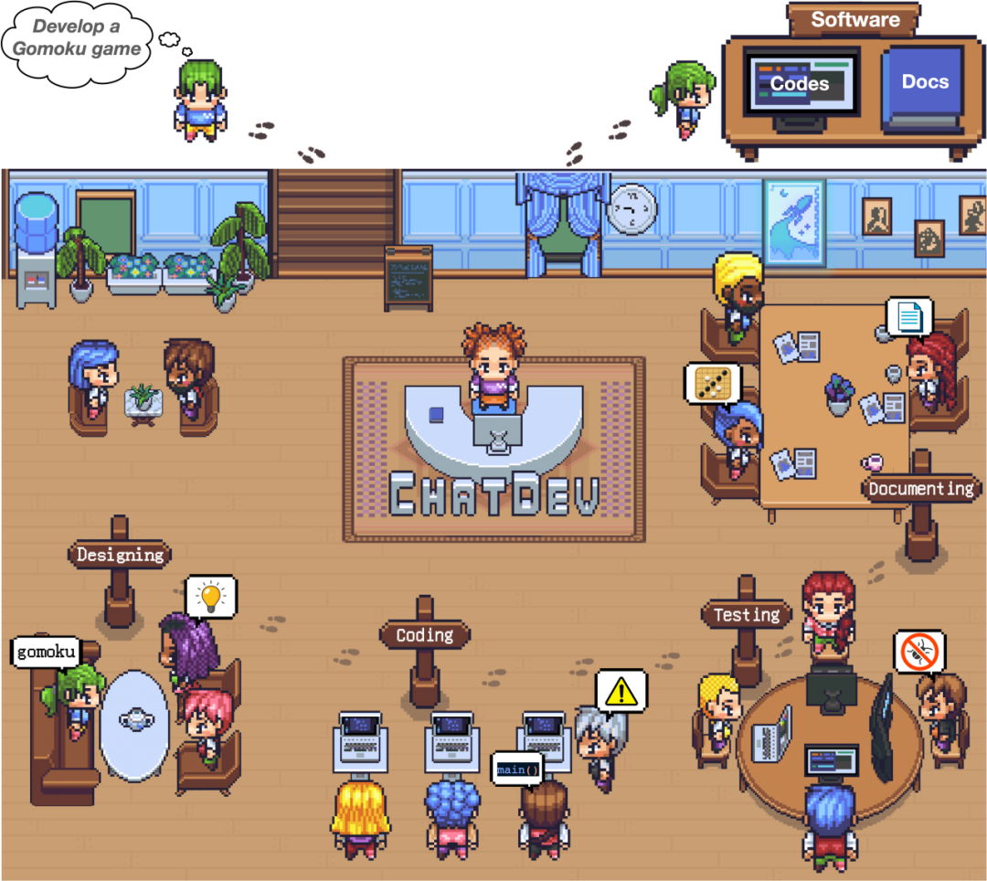 ChatDev 借鉴软件工程 瀑布模型(Waterfall Model)的思想,将其分为 软件设计(Designing)、系统开发(Coding)、集成测试(Testing)、文档编制(Documenting) 四个主要环节。