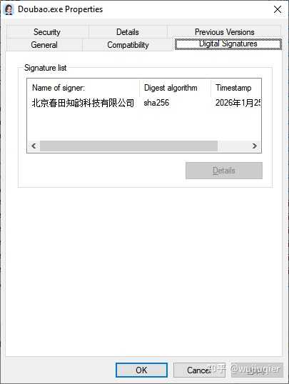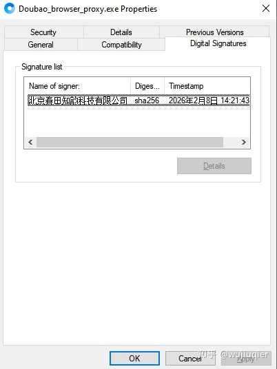 目前豆包团队尚未推出过名为“豆包浏览器”的产品(豆包团队推出的电脑客户端名为“豆包”而非“豆包浏览器”),请核实该浏览器主程序文件右键属性的数字签名是否为“北京春田知韵科技有限公司”,如果不是则基本可判定非豆包团队出品,请谨慎使用。
