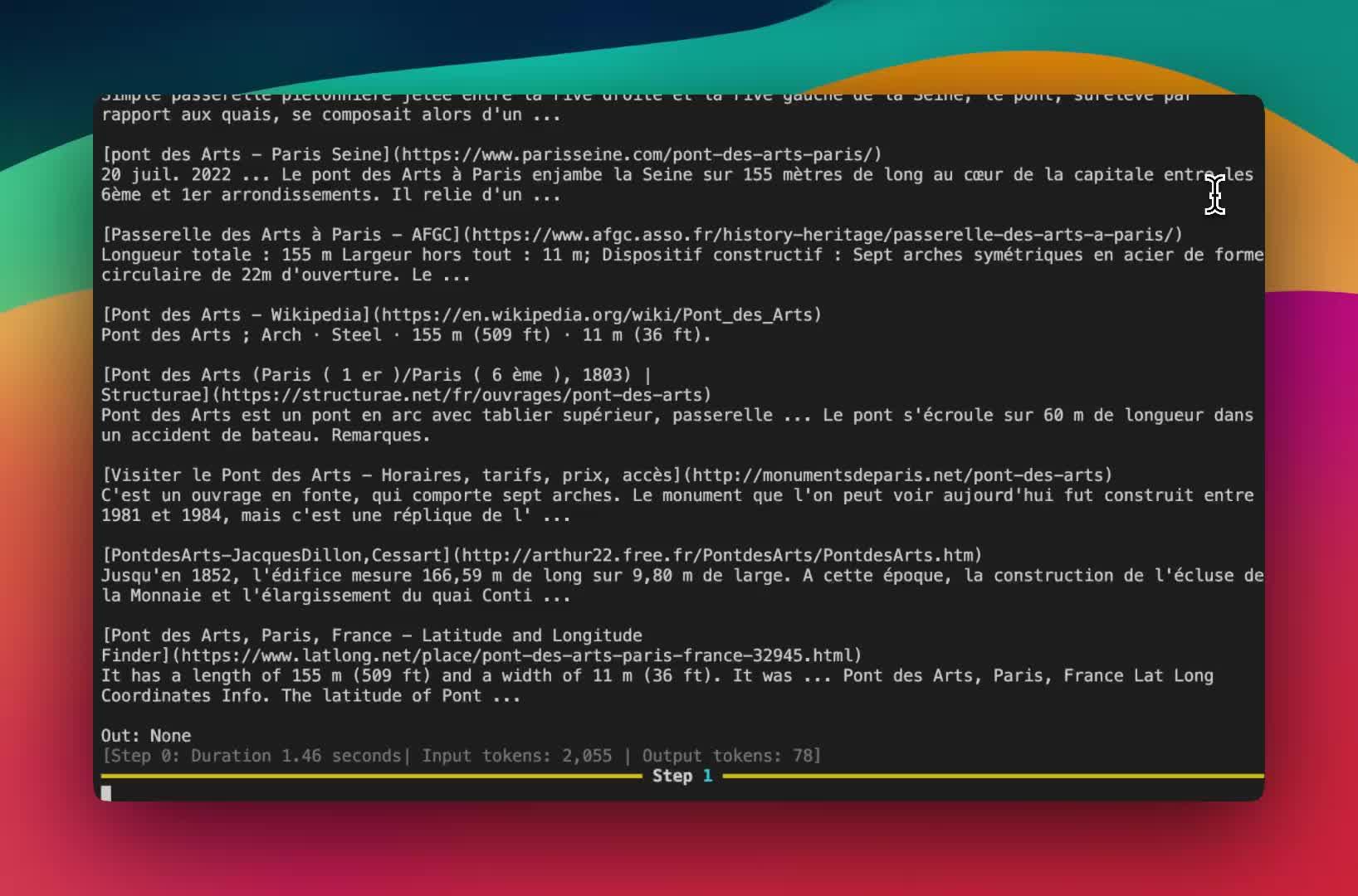 agent.run(“How many seconds would it take for a leopard at full speed to run through Pont des Arts?”) # 一只猎豹全速奔跑通过艺术桥(Pont des Arts)需要多少秒?