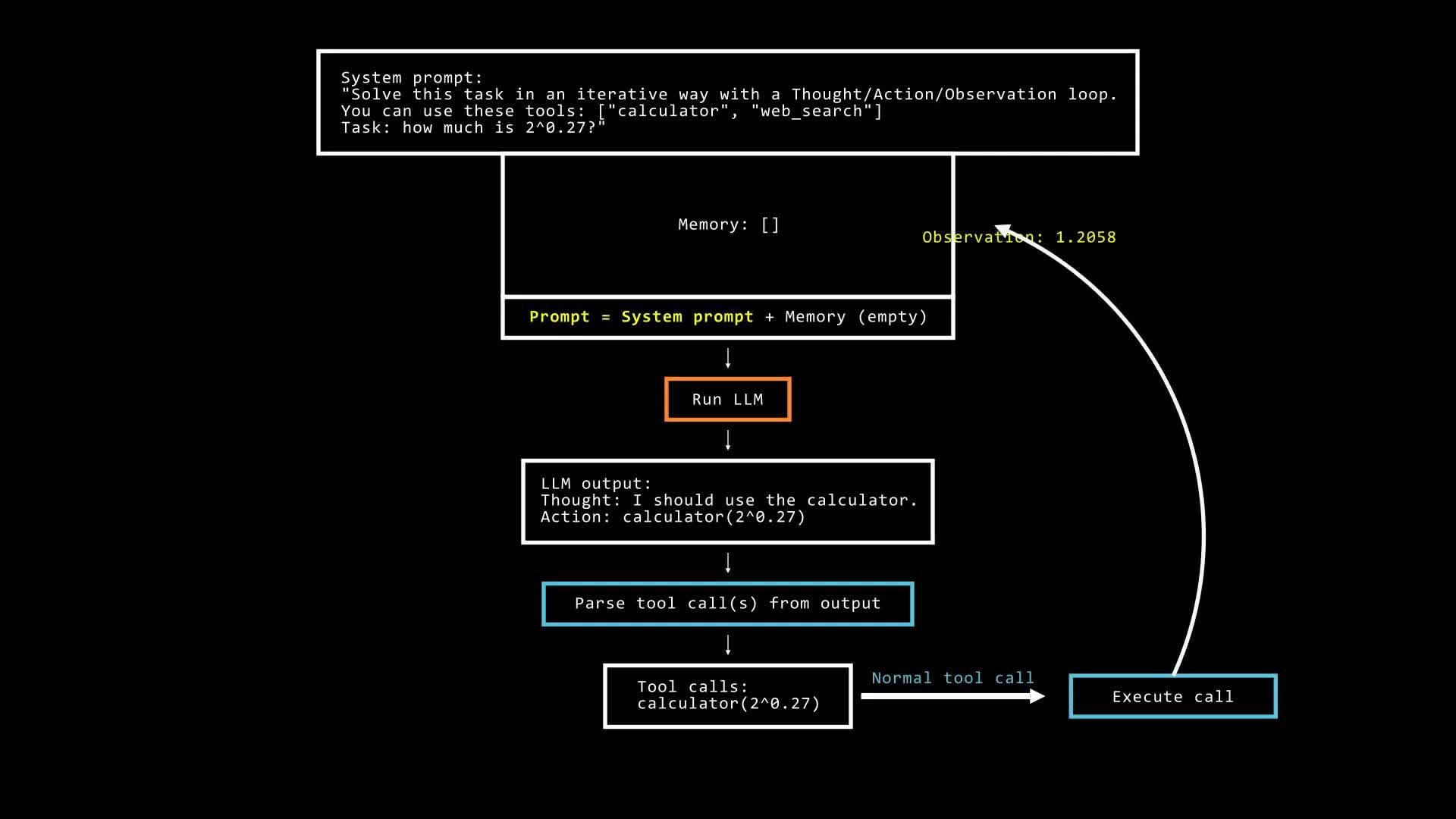 因此,这个系统在一个循环中运行,在每一步执行一个新的动作(这个动作可能涉及到调用一些预先确定的工具,这些工具只是函数),直到它的观察结果表明已经达到了一个令人满意的状态,以解决给定的任务。以下是多步代理如何解决一个简单的数学问题的例子: