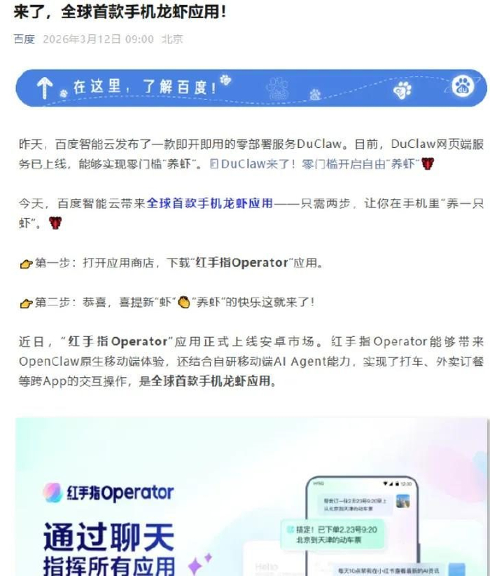 百度则发布了全球首款手机龙虾应用,只需两步,让你在手机里“养一只虾”。