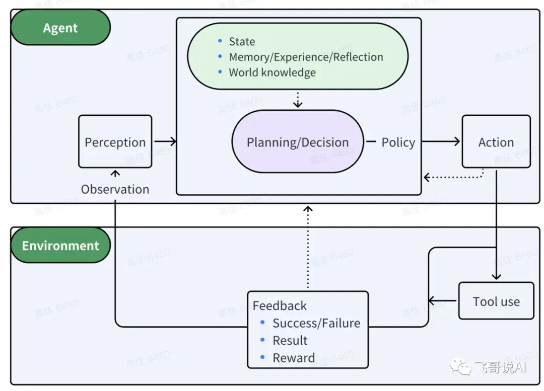 Agent的核心决策逻辑是让LLM根据动态变化的环境信息选择执行具体的行动或者对结果作出判断,并影响环境,通过多轮迭代重复执行上述步骤,直到完成目标。