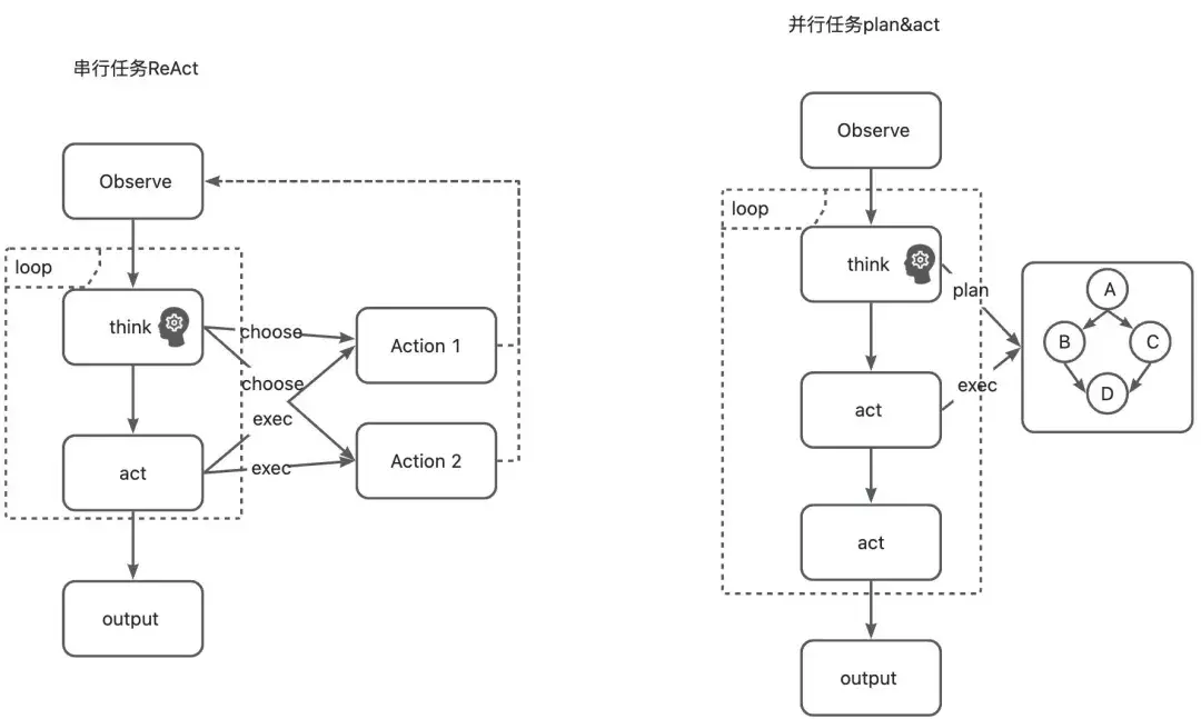 目前Agent主流的决策模型是ReAct框架,也有一些ReAct的变种框架,以下是两种框架的对比。