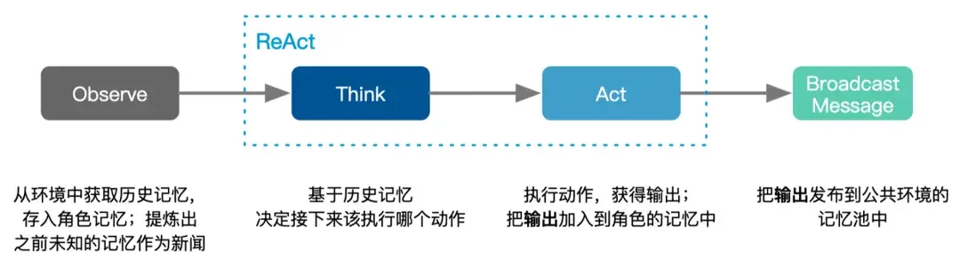 单智能体= 大语言模型(LLM) + 观察(obs) + 思考(thought) + 行动(act) + 记忆(mem)