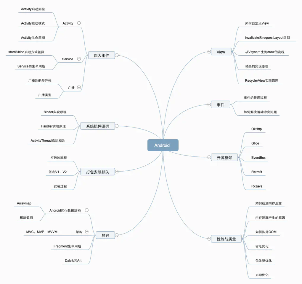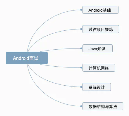 通过上述问题可以看出,对于面试过程除了原有项目的考察,对于知识点的考察上,主要是Android基础知识,Java基础知识,计算机网络,系统设计,算法,结合上述面试题目和自己准备过程中的一些学习记录,下面通过一个脑图的方式进行一个梳理。