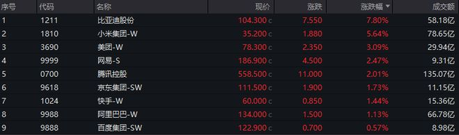 大型科技股集体回暖,小米集团涨超5%,美团涨超3%,腾讯涨超2%。