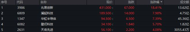 半导体板块走强,兆易创新涨超18%,澜起科技涨近8%,华虹半导体涨超7%。