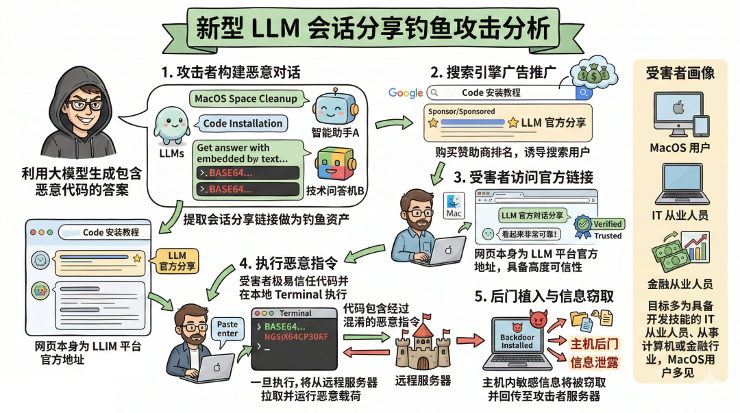 本次攻击事件揭示了一种令人警惕的社会工程学攻击范式演变:攻击者不再单纯依赖伪造的界面或粗劣的钓鱼邮件,而是巧妙地将攻击载荷“寄生”在可信度极高的大模型官方平台之上。通过结合搜索引擎的精准分发能力,这种“官方域名+AI回复+SEO投毒”的组合拳,本质上是对现代技术从业者生产力习惯的精准狙击。