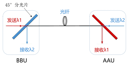 单纤双向主要通过WDM方式实现。如下图所示,BBU侧的光模块发送波长λ1的激光通过45°分光片后耦合进光纤,在AAU端,波长λ1的光信号经45°分光片反射后被接收;反之亦然。