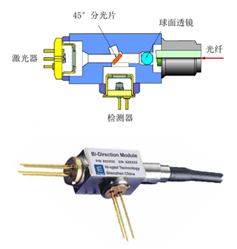 单纤双向光模块中的核心器件为45°分光片,分光片的光源照射面镀增透膜、反射面镀反射膜,增透膜和反射膜的原理可参考《无源波分系统中波分复用器的组成和原理》。光模块中的发射/接收器件(bosa)内部结构及实物照片见下图。