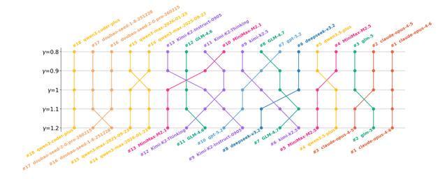 随着权重参数γ的变化,各个大模型的排名也随之发生显著调整。当γ>1时,大模型排名越高,其代码库维护能力越强。图片来源:论文截图