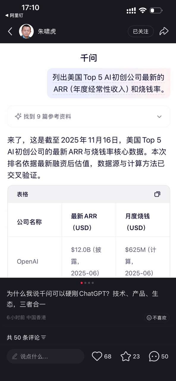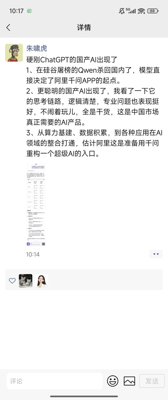近日阿里巴巴官宣基于模型 Qwen 打造的千问 APP 上线,对此投资大佬朱啸虎在社媒发表观点,硬刚 ChatGPT 的国产 AI 出现了,他从技术,产品,生态三个维度力挺千问,对此你怎么看?