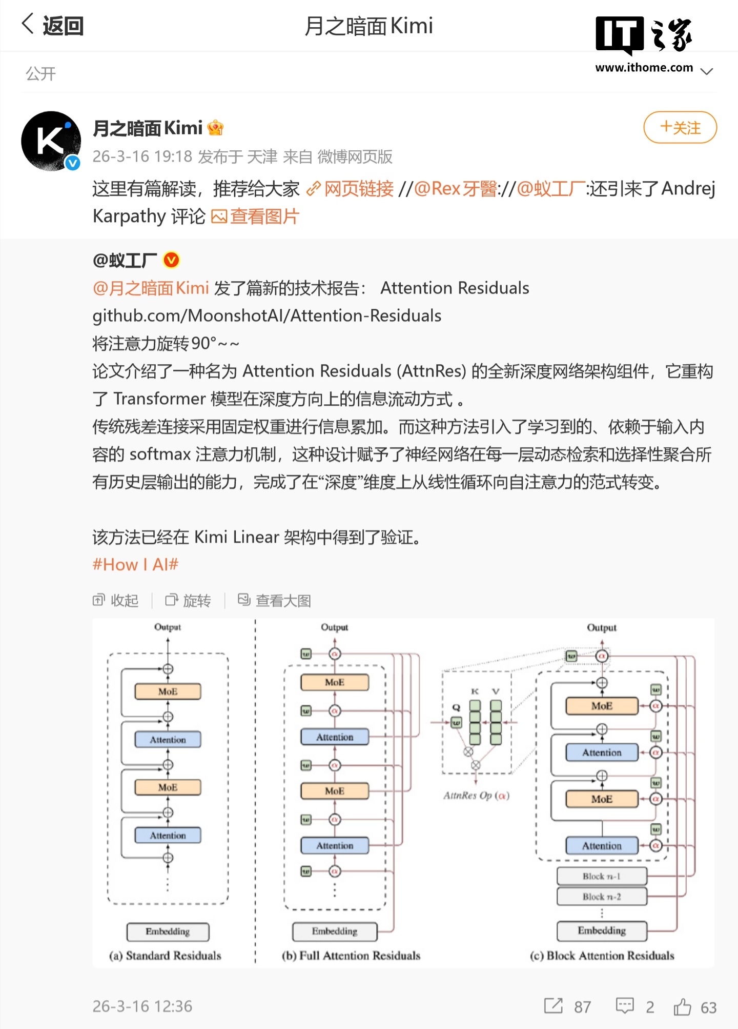 IT之家 3 月 17 日消息,“月之暗面 Kimi”官方账号今天(3 月 17 日)发布微博,回应埃隆 · 马斯克(Elon Musk)点赞其 Attention Residuals 技术报告,幽默称:“你的火箭造得也不错!”。