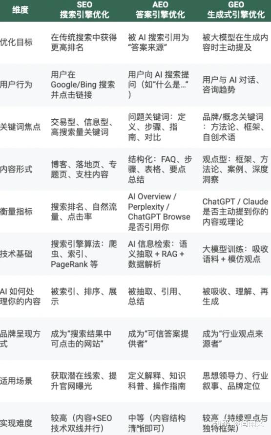 在 SEO 基础上,AEO(AI Engine Optimization,AI 引擎优化)与 GEO(Generative Engine Optimization,生成式引擎优化)是确保品牌信息直接出现在 AI 答案中的关键战术,其核心是 “让 AI 易于理解并主动推荐品牌”。