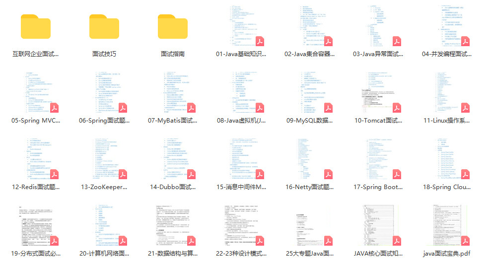 Java基础知识、Java集合容器面试题、Java异常面试重点、Java虚拟机、MyBatis、ZooKeeper、Tomcat、Dubbo、Netty、Elasticsearch、Memcached、 Redis、MySQL数据库、Spring、Spring Boot、Spring Cloud、Spring mvc、RabbitMQ、Kafka、 Linux 等技术栈、性能优化面试专栏、微服务架构面试专栏、并发编程高级面试专栏、开源框架面试题专栏、分布式面试专栏、计算机网络面试题、
