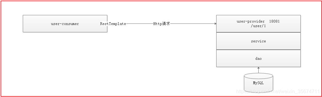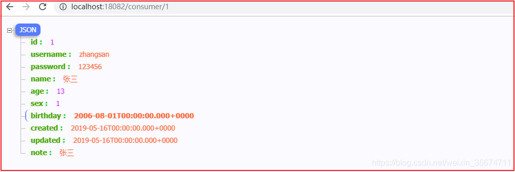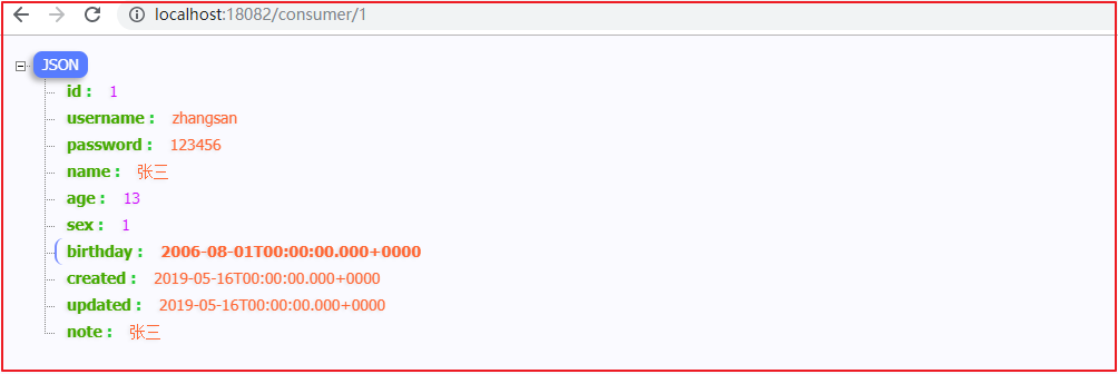 @RestController @RequestMapping(value = "/consumer") public class UserController { @Autowired private RestTemplate restTemplate; / * 在user-consumer服务中通过RestTemplate调用user-provider服务 * @param id * @return */ @GetMapping(value = "/{id}") public User queryById(@PathVariable(value = "id")Integer id){ String url = "http://localhost:18081/user/find/"+id; return restTemplate.getForObject(url,User.class); } }