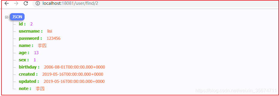 @RestController @RequestMapping(value = "/user") public class UserController { @Autowired private UserService userService; /* * 根据ID查询用户信息 * @param id * @return */ @RequestMapping(value = "/find/{id}") public User findById(@PathVariable(value = "id") Integer id){ return userService.findByUserId(id); } }